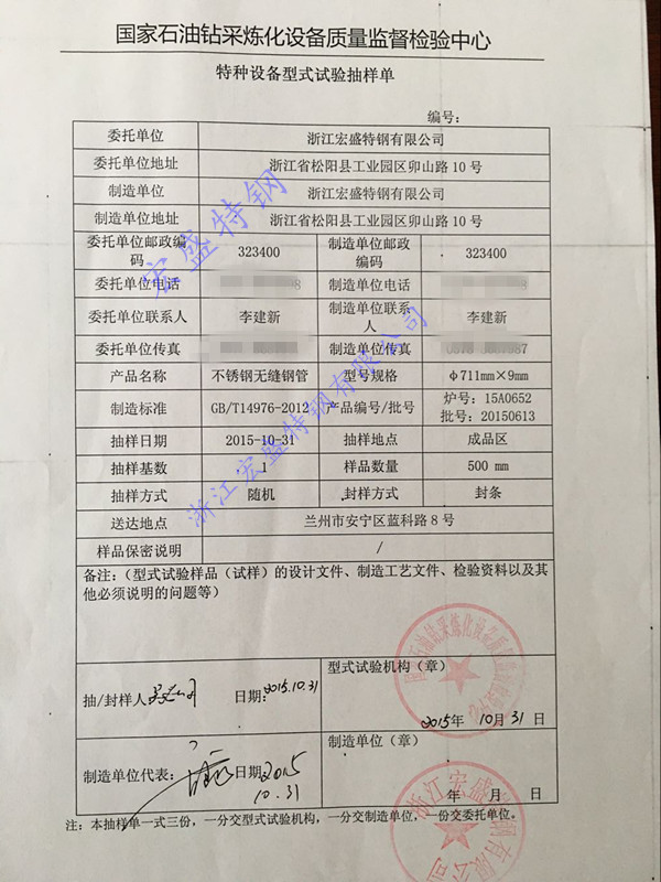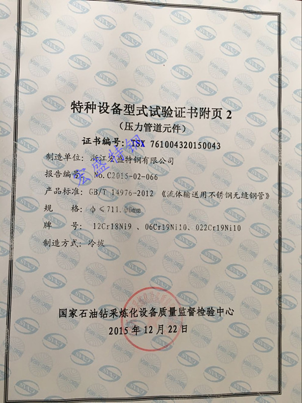 2015年12月22日,公司生產(chǎn)的規(guī)格為:711mm×9mm大口徑薄壁不銹鋼無(wú)縫鋼管,通過(guò)國(guó)家石油鉆采煉化設(shè)備質(zhì)量監(jiān)督檢驗(yàn)中心特種設(shè)備型式試驗(yàn)。